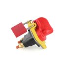 Metallic - Yellow lockable bracket - Lockable with padlock - Similar description: battery master switch, battery switch, battery cut off switch, battery disconnect switch, battery main switch, master disconnect, battery disconnector, SPDS